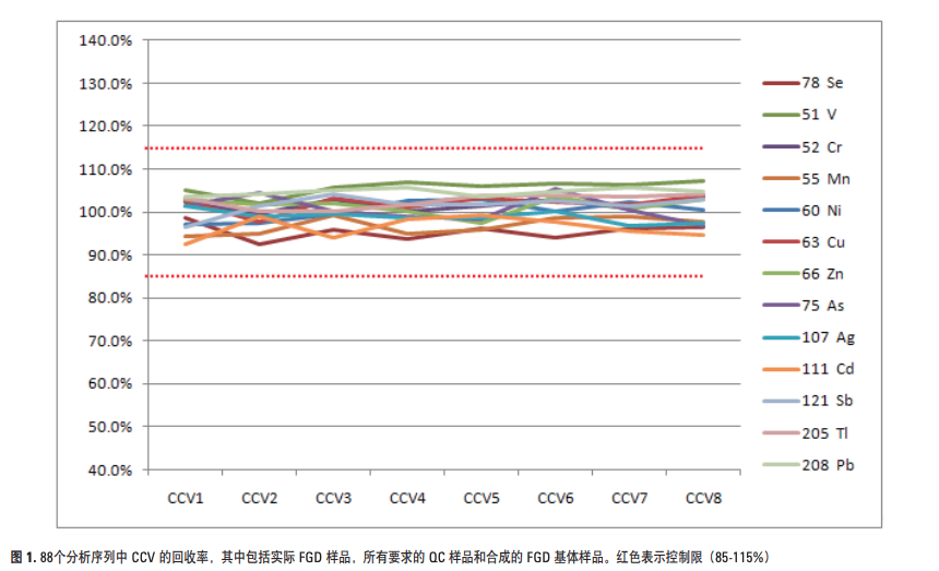 在较长的分析序列中分析实际 FGD 样品时,必须按照典型 的 EPA 准则对仪器连续运行的性能进行监控。10 个样品 为一组,除了 7 个未知样品外,还必须包括一个已知浓度 的实验室控制样品(LCS),一对基体加标/基体双倍加标 (MS/MSD)。