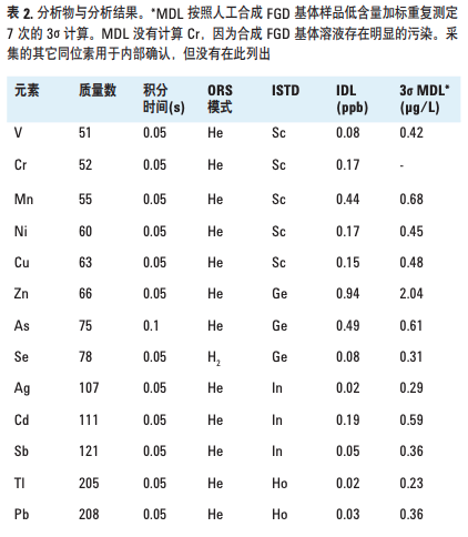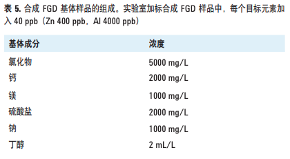 每一种基体成分单独检测后,按表 5 所列的成分配置混合溶 液,同时配置一个相同基体但添加 40 ppb 所有加标分析元 素的溶液。这些新配置的 FGD 基体样品和 EPA 方法 6020 要求的干扰检查溶液 ICS-A 和 ICS-AB 类似,但合成的 FGD 基体样品总溶解固体量(TDS)高于 ICS-A 和 AB 溶液,而 且含有的基体元素普遍高于实际 FGD 样品。FGD 基体样品 中包含总 TDS >1%(10000 ppm)的具体组成见表 5。合 成 FGD 基体空白和合成 FGD 基体加标的分析结果见表 6。