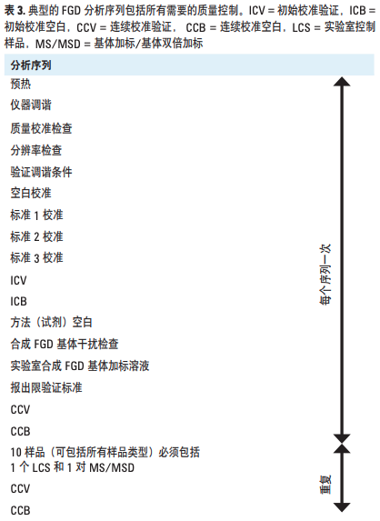 对新的 FGD 废水分析方法的质量控制基于其它 EPA 方法中 采用的典型方案。在开始常规操作之前,初始方法验证需要 测定方法检出限、线性范围并分析多元素和单元素干扰检查 溶液,用以评价在方法所采用的碰撞反应池条件下消除多原 子干扰的有效性。表 3 是常规应用中典型分析序列的常用质 量控制分析。