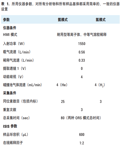 标准的 7700x ICP-MS 有 Micromist 雾化器和可选的 ISISDS。HMI 气溶胶稀释设置为“medium”,用 MassHunter ICP-MS 软件自动对等离子体的参数与耐用性(CeO+ /Ce+ 比 约为 0.2%)进行优化。MassHunter 使用与所用雾化器类 型相匹配的 HMI 优化算法,确保每次分析之间和仪器之间 的重现性条件。操作参数列于表 1。
