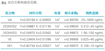 表3,VA、25OHVD2、25OHVD3、VE和VK1在相应的浓度范围内