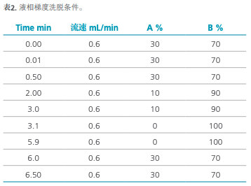 色谱柱使用Phenomenex kinetex C18 column (50×3.0 mm, 2.6 μm)进行分离,流动相选用水(含0.1% 甲酸)作为A相,和