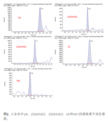 取离子流图。图2是人全血中VA、25OHVD2、25OHVD3、VE和