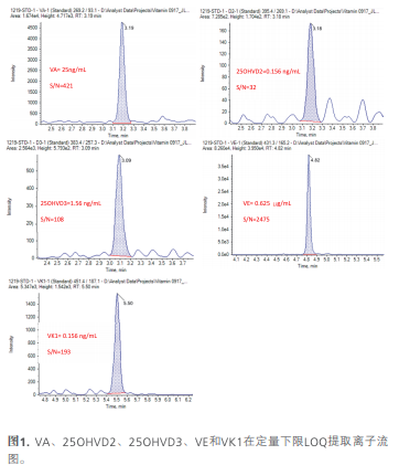 图1 VA、25OHVD2、25OHVD3、VE和VK1在定量下限LOQ提