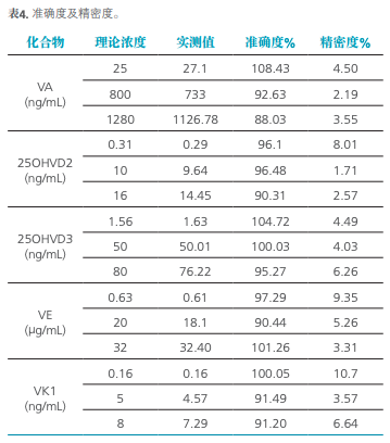 25OHVD3、VE和VK1的精密度(RSD)和准确度方法验证。从表4可以