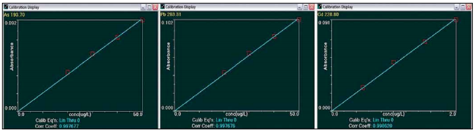 图2. 直接进样测定食用油中的As, Pb,和Cd的标准曲线
