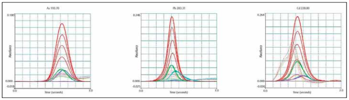 图3. 使用PinAAcle 900T分析食用油中的As、Pb和Cd的峰形图,包括标准(红色),质量控制检查(绿色),和样品(各种颜色)。实线