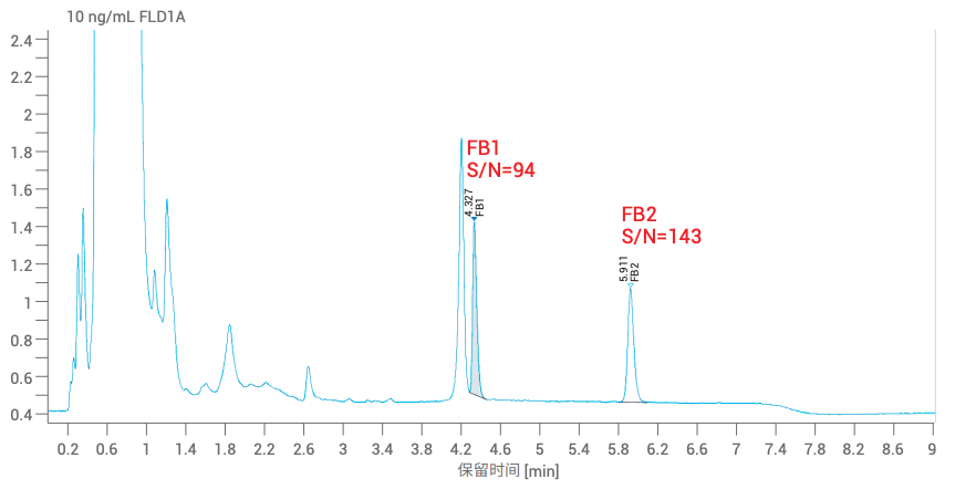 噪比为 143。由此推断,FB1 和 FB2 的检测限可达 300 pg/mL 左右,定量限可达 1 ng/mL 左右;而**标准中指出,当称样量为