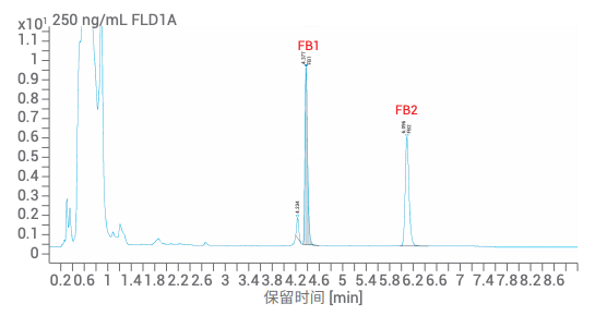 图 1. 250 ng/mL 伏马毒素标准样品中 FB1 和 FB2 的分离结果