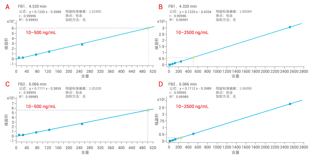 图 2. FB1 和 FB2 的低浓度范围(10–500 ng/mL,A 和 C)和高浓度范围(10–2500 ng/mL,B 和 D)标准曲线
