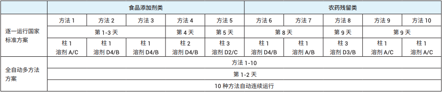 h。分别采用逐一运行**标准方法方案和全自动多方法方案运行食品添加剂和农药残留等 10 种分析方法,若每个方法进样 40 针,两种