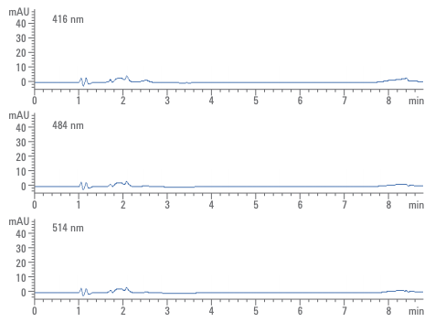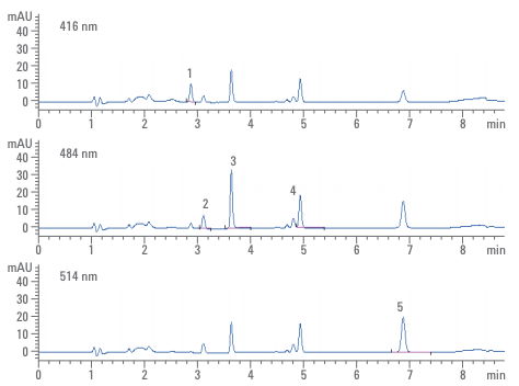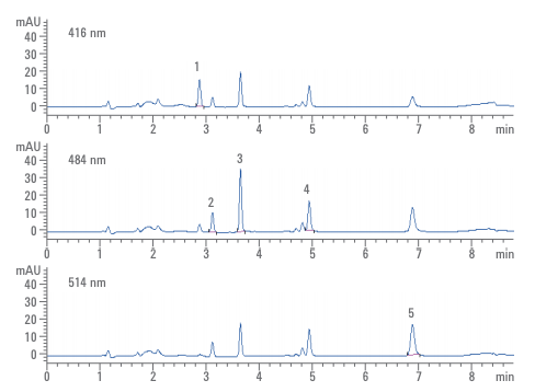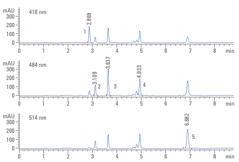 检测波长:416 nm(酸性黄 36);484 nm(颜料橙 5、颜料红