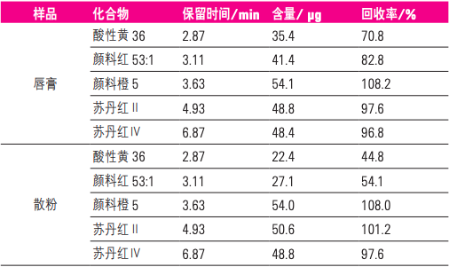 唇膏和散粉样品中 5 种禁用着色剂的分析结果和回收率数据