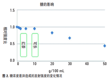结果表明,糖的浓度约高达 10 g/100 mL 时并没有对发射强