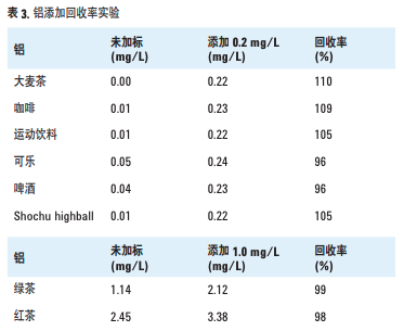 向每个样品中添加铝,回收率实验的结果见表 3。