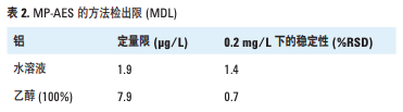 本研究表明,铝在水溶液中的定量限为 1.9 µg/L,在乙醇