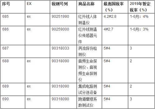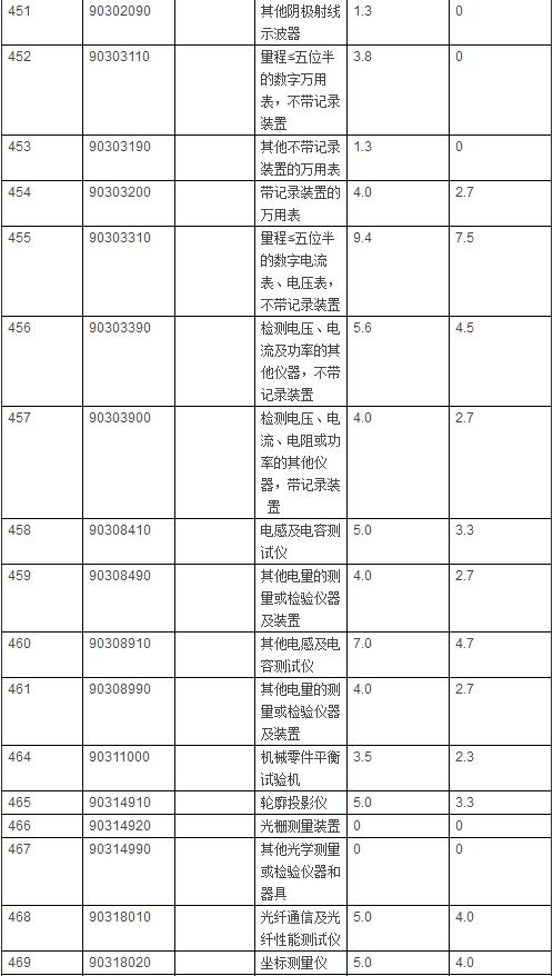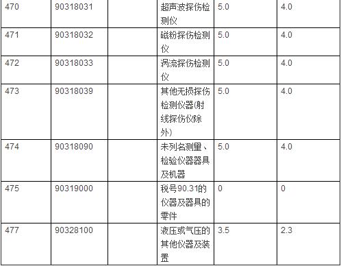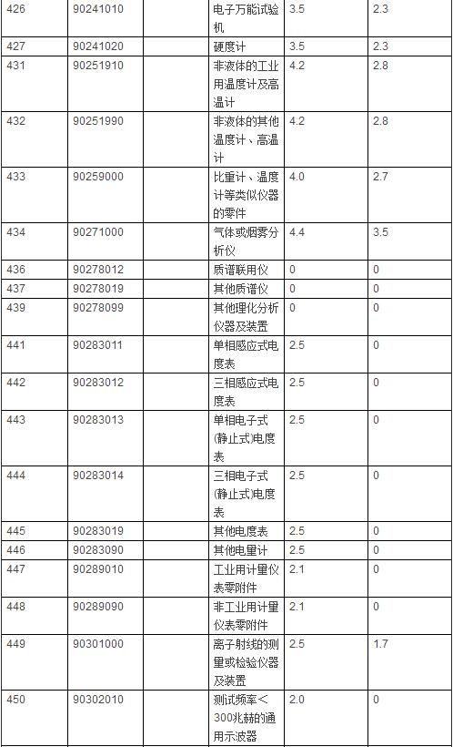 仪器相关进口商品暂定税率表: